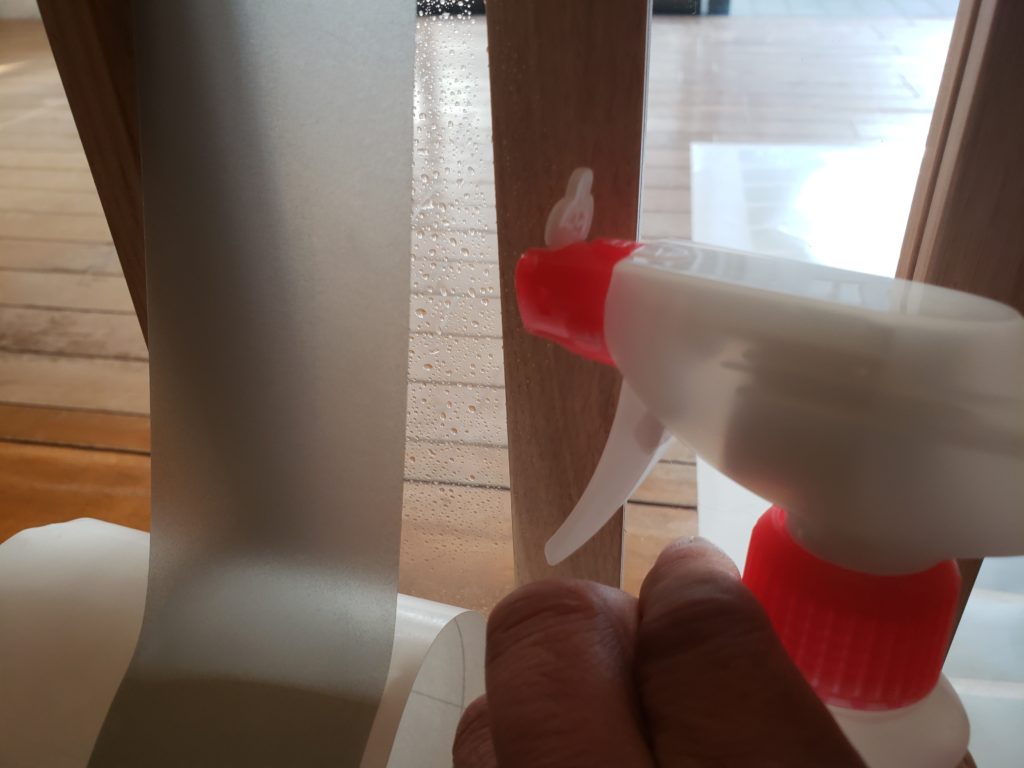 그냥 물보다는 거품이 들어있는 (계면활성제)가 들어가서 미끌리는 세제가 들어간 물을 사용해야 잘못시공했을경우 밀거나 당기거나 하는데 좋습니다. 물을 뿌리지 않고 하다가는