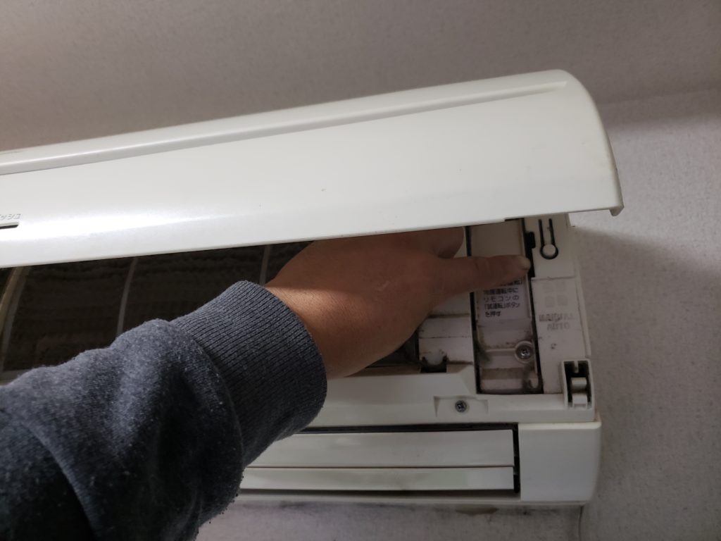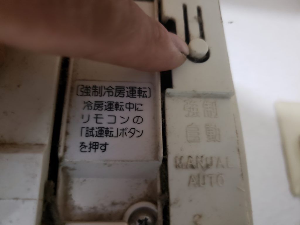 본체 응급처치 버튼을 눌러서 강제 냉방 모드로 운전시킵니다.