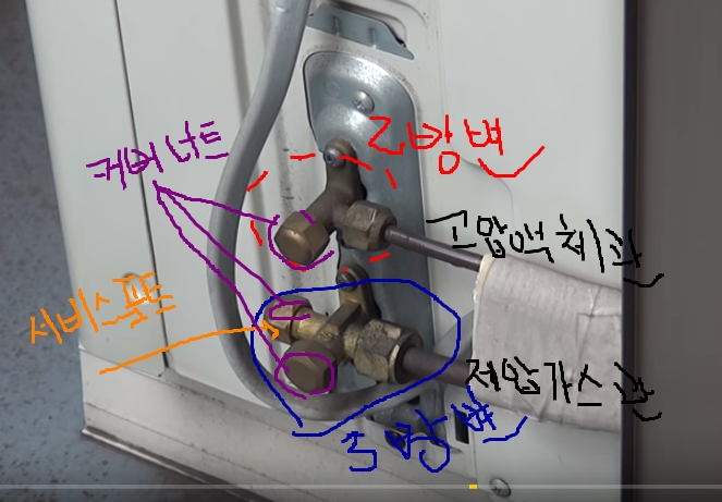 2방변 ? 변이 두개붙어있는 고압액체관변부분 “아래사진 빨강색원으로 둘러쌓인부분을