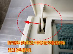 실내기의 필터커버를 아래사진과 같이 손가락을 넣어서 위로 제쳐올립니다.