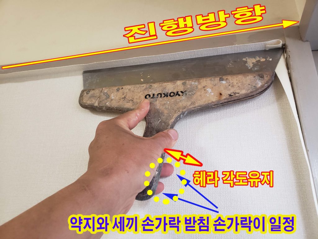엄지와 검지로 떠있는 벽지를 누르고 있으며 동시에 앞으로 진행할때는 엄지와 검지를 이용해서 앞으로 진행하여줍니다. 밀착시켜서 진행할때 앞부분의 뾰족한 부분에 벽지가 찢어지는 경우가 있으므로 헤라끝의 둥근부분을 진행방향으로 대놓고 커터로 재단하는 프로들도 있으며 . 저같은경우 양쪽 다사용합니다.