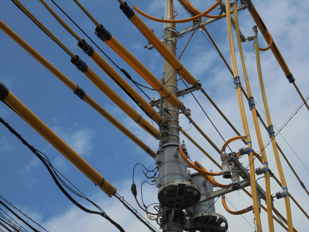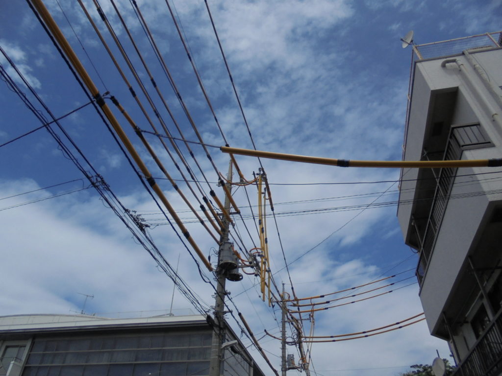 처음에 일본에 와서 놀랜것중하나가 이런부분들이었는데요, 일본의 전신주 저압 전선의 경우 도로에서는 최하5m높이에 차량과 특수차량등의 통행에 지장이 없는 높이로 설정되어있습니다.