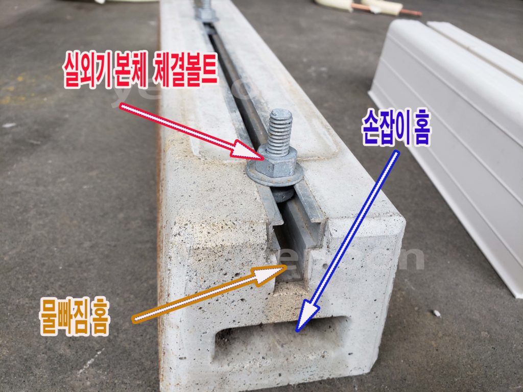 비싼 가격답게 아래사진을 보시면 콘크리트틀에서 찍어낸 받치대에 알류미늄레일 아래는 물이 빠질수있게 해놓으므로써 몇년의 시간이 흘러도 녹으로 볼트나사 부분이 완전부식되어버리는것을 조금이나마 방지 지연시킬수있는 궁리를 해놓았습니다.